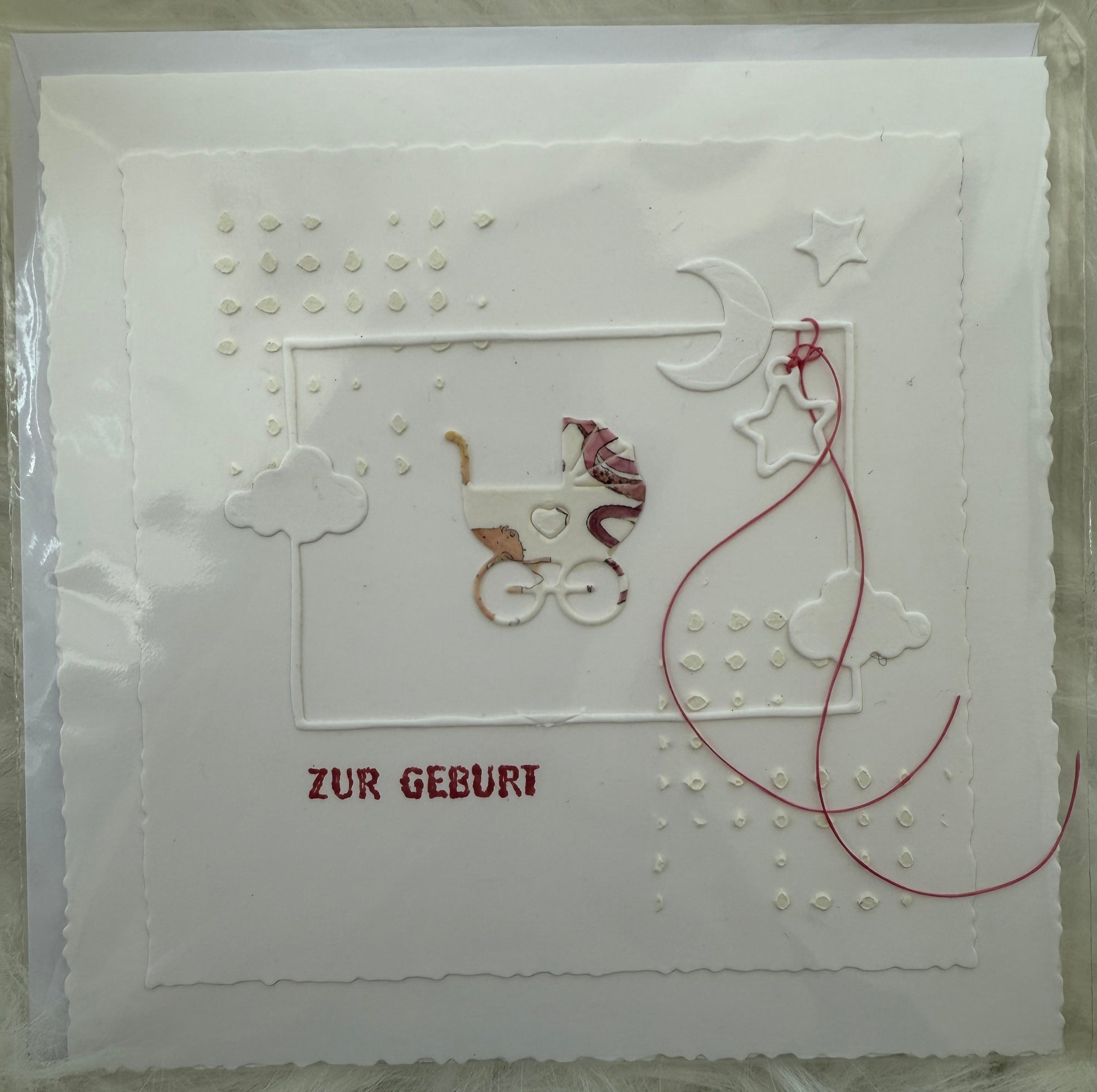quadratische handgemachte Glückwunschkarte (Billet) zur Geburt